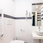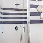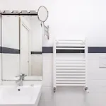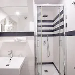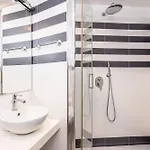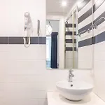 Bathroom facilities also include a bidet, a separate toilet, and a shower. There are hair dryers and towels for guests' comfort.